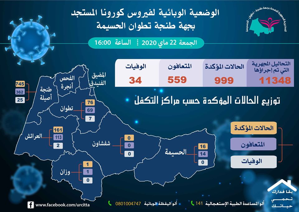 كشفت المديرية الجهوية للصجة بطنجة تطوان الحسيمة، اليوم الجمعة 22 ماي، عن آخر الأرقام المتعلقة بالحالة الوبائية لفيروس كورونا بجهة الشمال، حيث بلغت عدد الحالات المؤكدة 999 إصابة، بعد تسجيل 16 إصابة جديدة خلال 24 ساعة الأخيرة، فيما ظلت مدينة طنجة تحتل الصدارة في عدد الحالات المؤكدة ب 745 حالة.