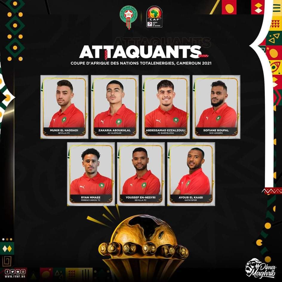 الهجوم: سفيان بوفال، زكرياء أبوخلال، منير الحدادي، أيوب الكعبي، يوسف النصيري، ريان مايي.