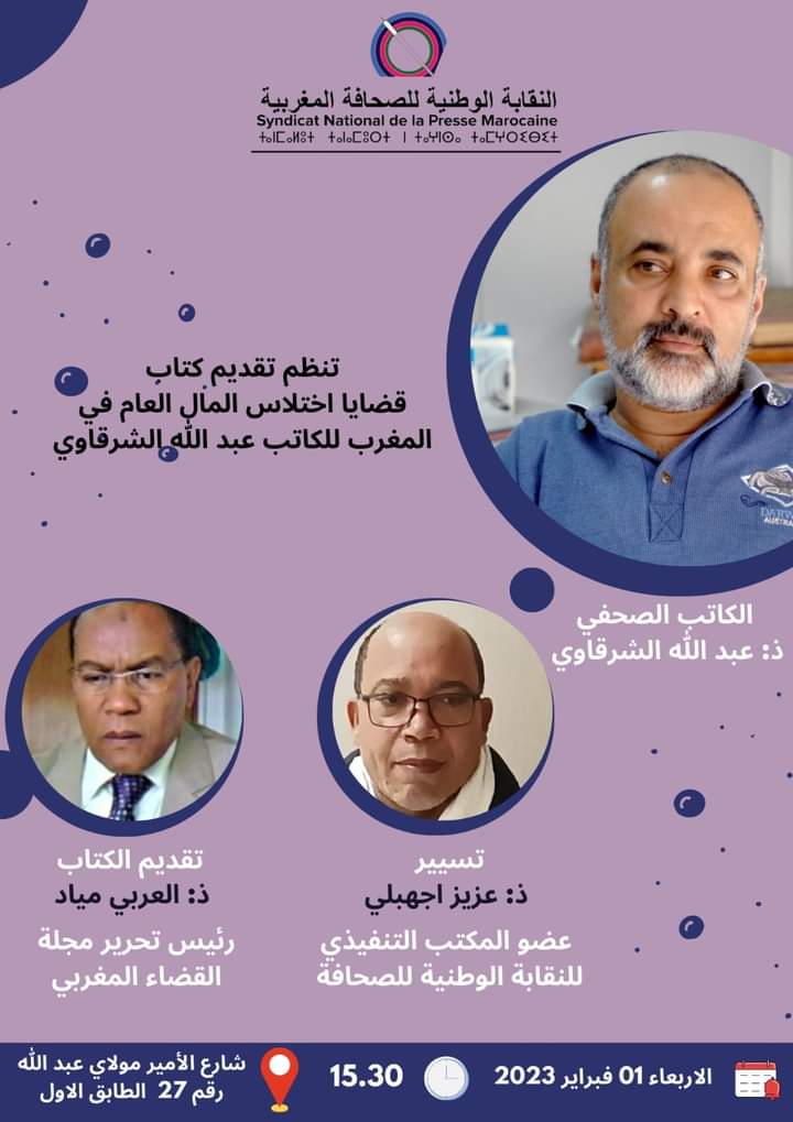 ستنظم النقابة الوطنية للصحافة المغربية، بمقرها بالرباط، يوم الأربعاء 01 فبراير 2023، على الساعة الثالثة والنصف زوالا، حفل تقديم كتاب: “قضايا اختلاس المال العام في المغرب”، للكاتب الصحافي عبد الله الشرقاوي.