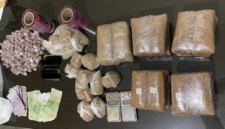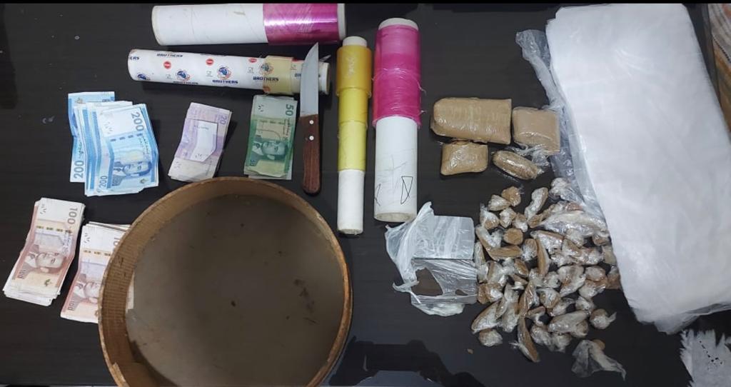 و بحي المصلى تم حجز 760 غرام من مخدر الشيرا على شكل قطع كبيرة و قطع صغيرة معدة للبيع علاوة على مبلغ مالي مهم و سلاح ابيض متوسط الحجم و مجموعة من الاكياس البلاستيكية المستعملة لتغليف المخدرات ، كما ضبط بداخل المنزل المذكور 03 كلاب مروضة من فصيلة ” مالينوا ” يشتبه في حيازتها و الاستعانة بها في التحريض ضد الاشخاص و مقاومة عناصر الشرطة .