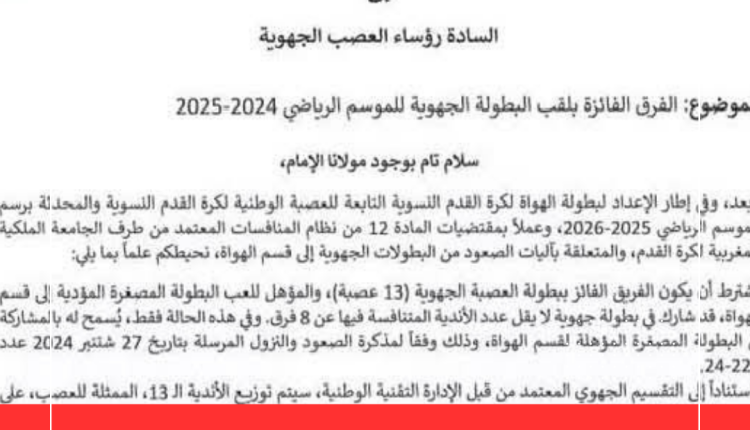 وبعد، وفي إطار الإعداد لبطولة الهواة لكرة القدم النسوية التابعة للعصبة الوطنية لكرة القدم النسوية والمحدثة برسم الموسم الرياضي 2025-2026، وعملاً بمقتضيات المادة 12 من نظام المنافسات المعتمد من طرف الجامعة الملكية المغربية لكرة القدم، والمتعلقة بآليات الصعود من البطولات الجهوية إلى قسم الهواة، نحيطكم علماً بما يلي: